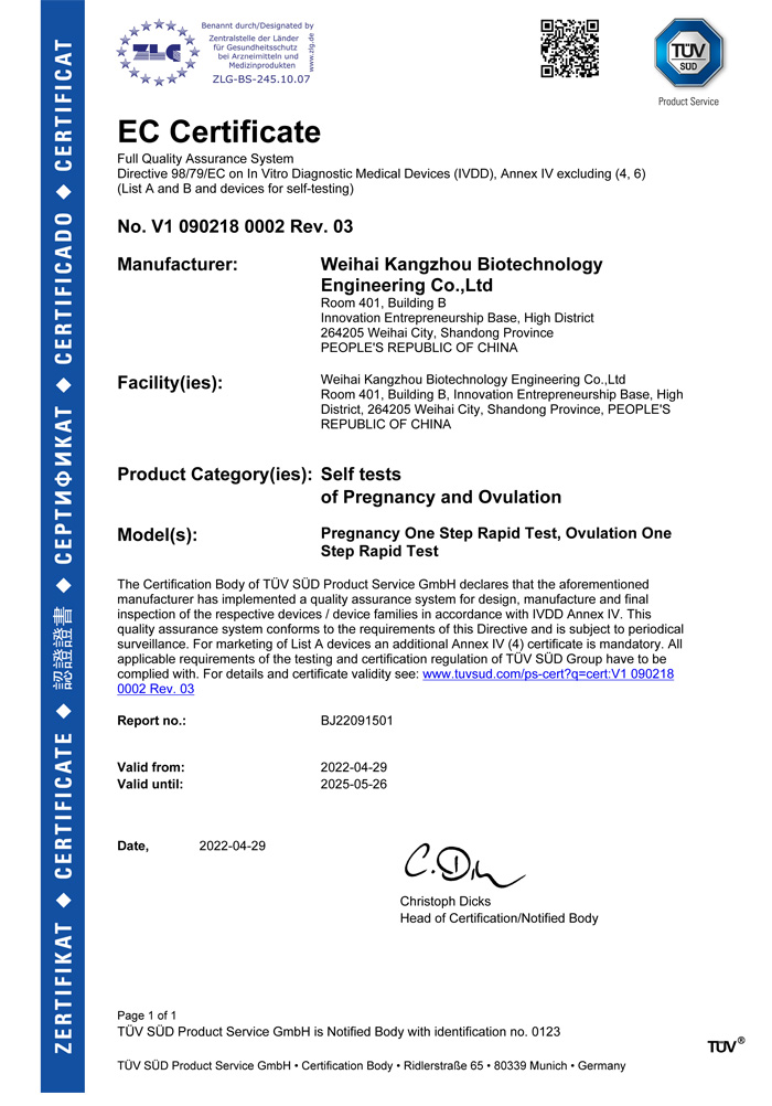 ? ? ?威??抵萆锕こ逃邢薰境闪⒂?013年,公司坐落于風景秀麗的海濱小城——威海市。康州生物是集研發、生產和銷售于一體的生物科技公司,與威海哈爾濱工業大學合作研發團隊,擁有先進的科研基地及生產基地。主要從事快速診斷檢測產品的研發、生產、銷售。產品涵蓋:生育檢測、藥物濫用檢測、農藥殘留檢測以及其他臨床診斷檢測等。公司自主研發生產得早早孕試紙,排卵檢測試紙,毒品檢測及疾病檢測等醫用產品,經過歐盟認證,產品質量穩定,值得信賴。
